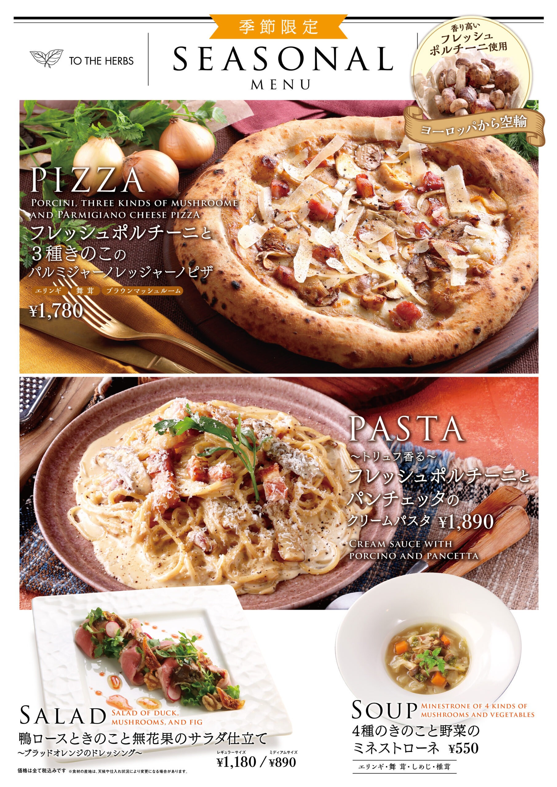 香り高いポルチーニをふんだんに使用した ピッツァ&パスタをご用意しました! 贅沢な秋の味覚をぜひご賞味ください。